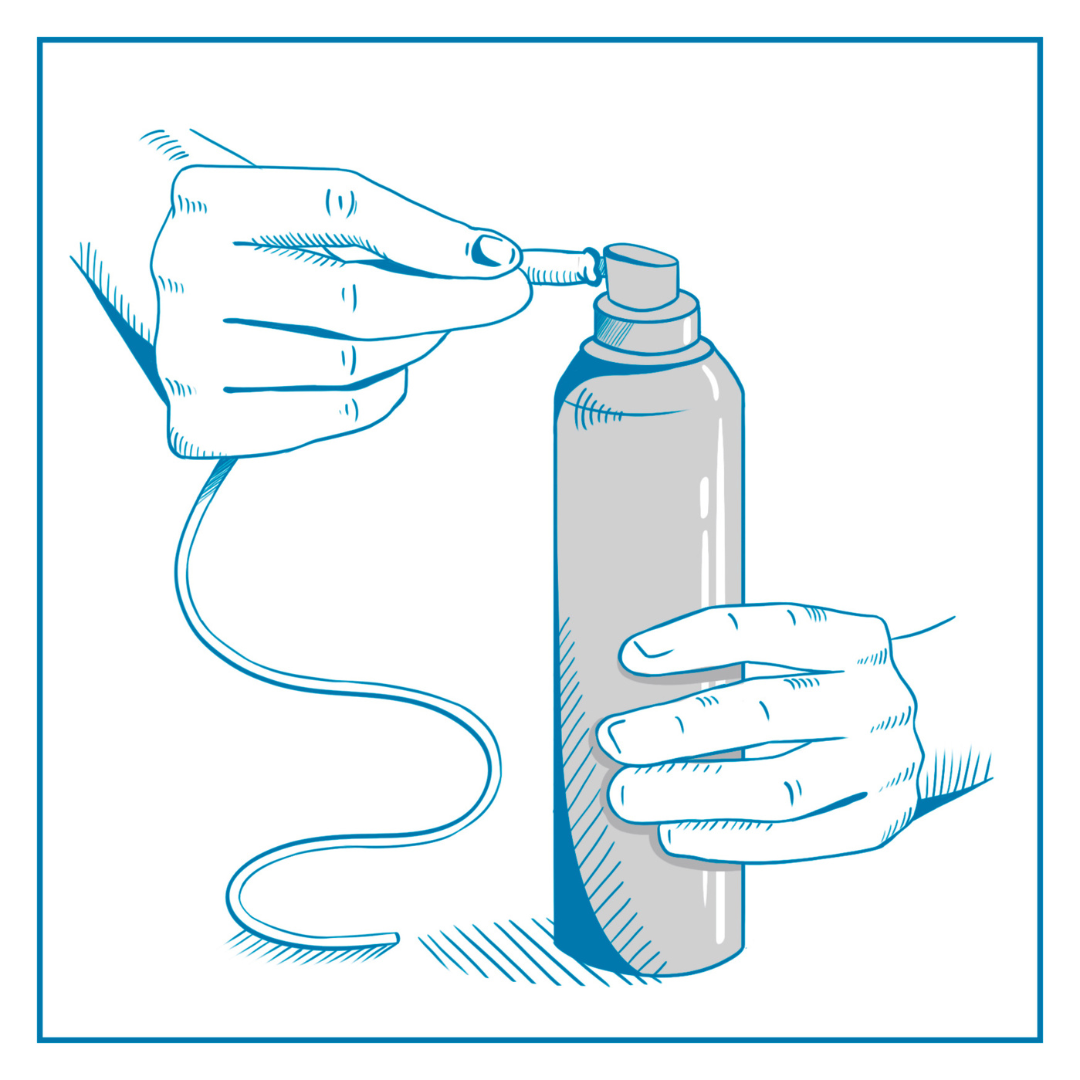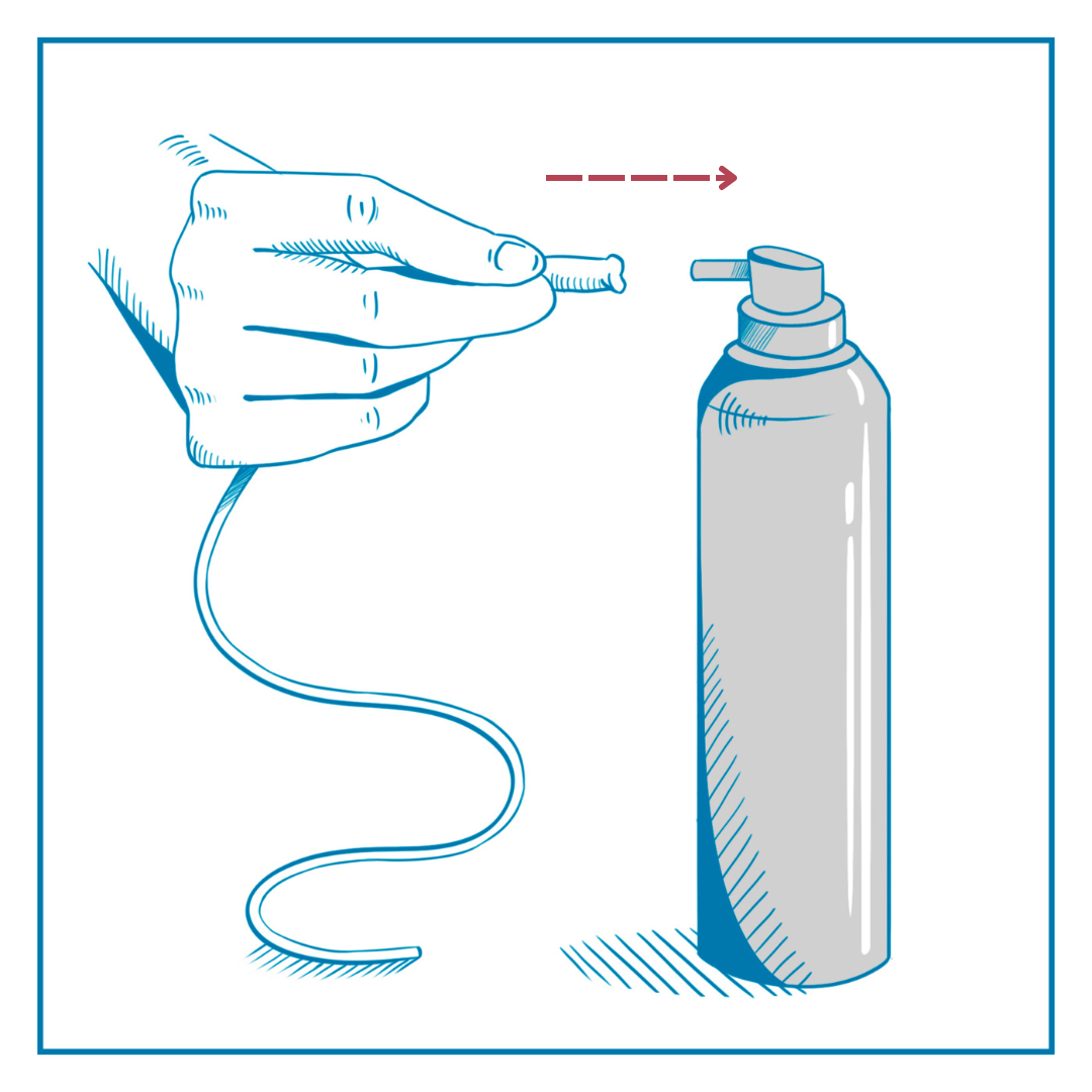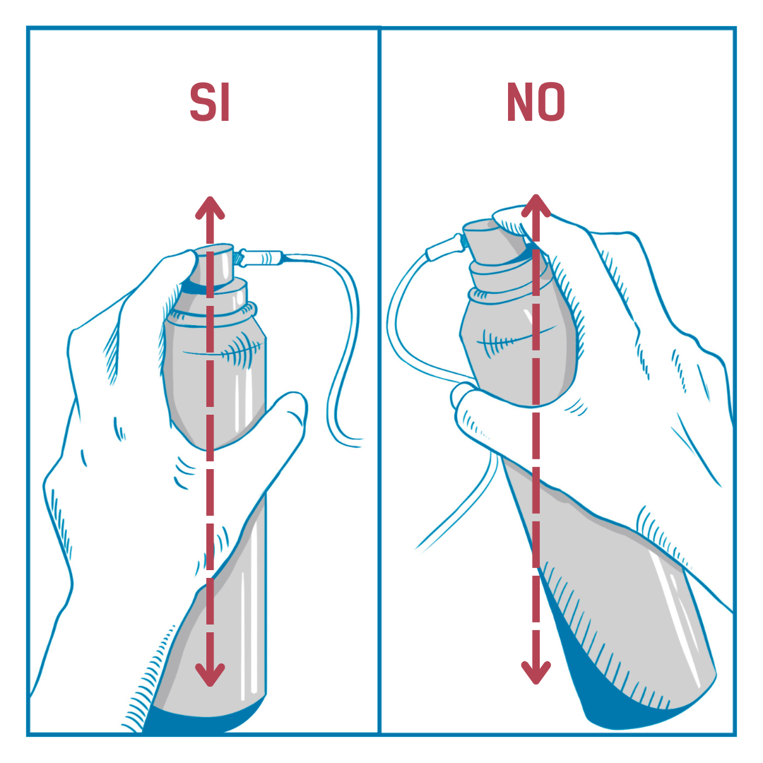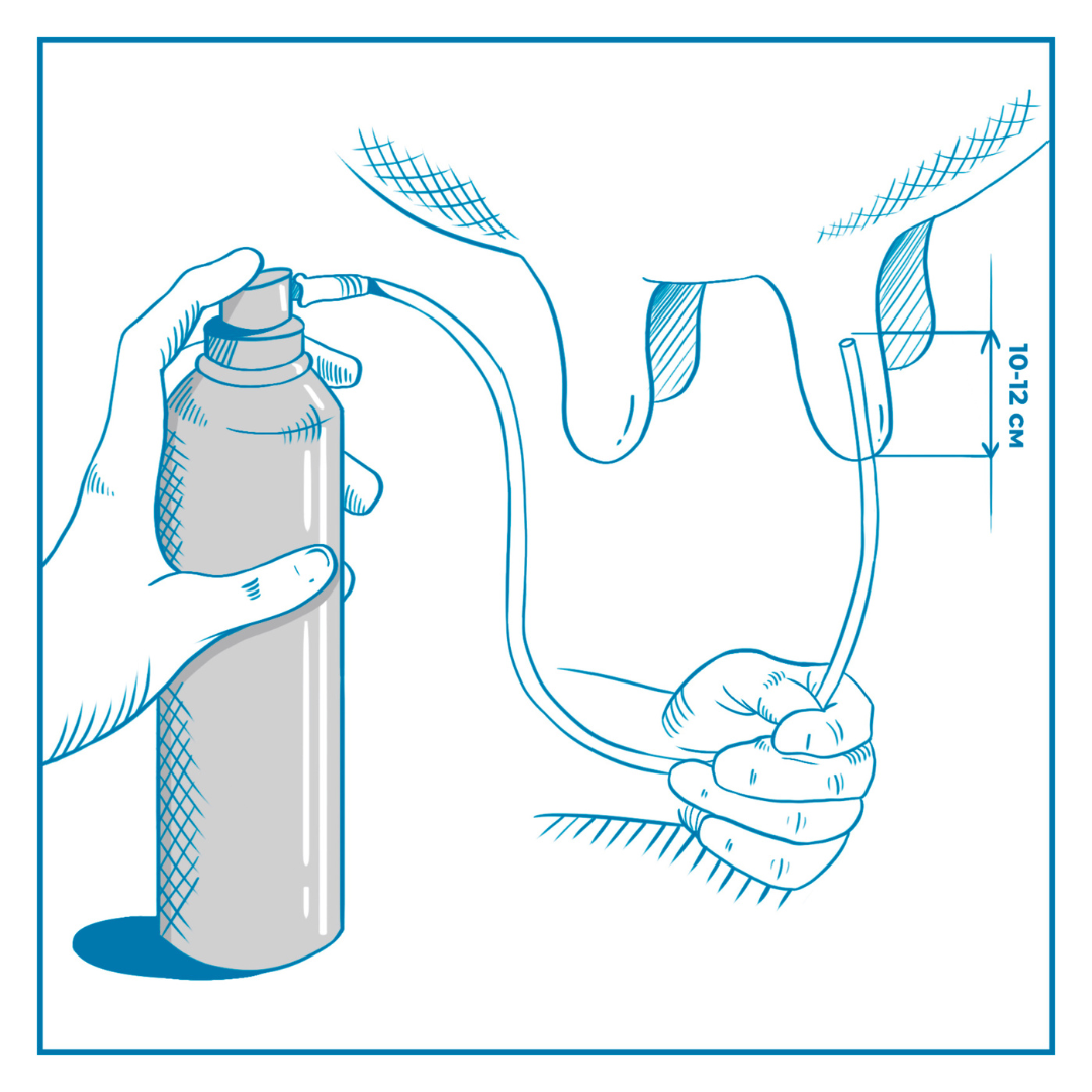 Inserire il catetere nel capezzolo per almeno 10 / 12 cm. Evitare il contatto con la parte del catetere che verrà inserita nel capezzolo, in quanto sterile. Premere e utilizzare l’intero contenuto della bombola.